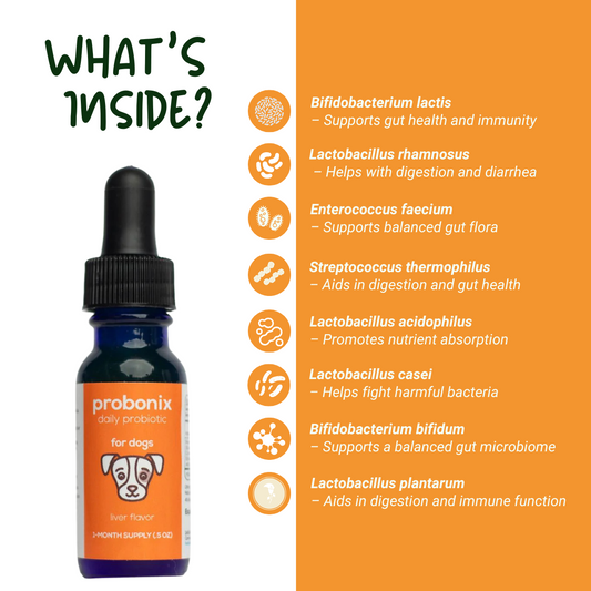 Vendor:Microbiome Labs(42)Regular price $37.97 USDRegular priceUnit price perSale price $37.97 USDGive your dog the digestive and immune support they need with Dog Probonix, a premium liquid probiotic scientifically formulated to promote gut health, digestion, and overall well-being. Unlike other probiotics, our unique formula has a 10-12 times higher survival rate, ensuring more beneficial bacteria reach your dog’s gut where they’re needed most. Dog Probonix contains 8 of the most effective probiotic strains, each carefully selected to support digestion, reduce inflammation, and boost im...