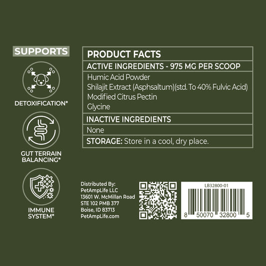 Vendor:PetAmpLife(42)Regular price $49.95 USDRegular priceUnit price perSale price $49.95 USDHumic Acid Powder for Dogs and CatsPets face daily exposure to environmental toxins, from lawn chemicals to household cleaners. Daily Detox offers a gentle way to support your pet’s wellness using a blend of naturally derived ingredients known for their detox-friendly properties. This formula features humic acid powder, shilajit extract (standardized to 40% fulvic acid), modified citrus pectin, and glycine. Together, these ingredients support natural elimination pathways, gut health, and over...