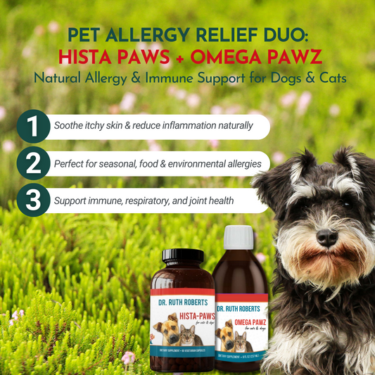Vendor:Dr. Ruth Roberts Bundles(42)Regular price $84.54 USDRegular priceUnit price per$88.99 USDSale price $84.54 USDIs your pet constantly itching, sneezing, or suffering from allergies? The Pet Allergy Relief Duo is the ultimate natural solution to combat allergy symptoms and support your pet’s overall health. 🐶 Hista Paws acts as a natural antihistamine, blocking histamine release and reducing allergy symptoms like sneezing, itching, and inflammation. With Quercetin and Nettles, it supports respiratory health, kidney function, and immune balance—all without harsh medications. 🐟 Omega Pawz delivers pure,...