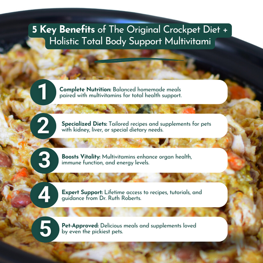 Vendor:Dr. Ruth Roberts Bundles(42)Regular price $99.00 USDRegular priceUnit price per$113.00 USDSale price $99.00 USDGive your pet the best of both worlds with the The Original Crockpet Diet + Holistic Total Body Support Multivitamins Bundle. Designed by Dr. Ruth Roberts, this combo ensures your furry friend gets the optimal nutrition they need from delicious, homemade meals and a daily dose of essential vitamins, minerals, and glandular extracts to support their total body wellness. The Original Crockpet Diet teaches you how to prepare balanced, nutritious meals tailored to your pet’s needs, whether it’s...