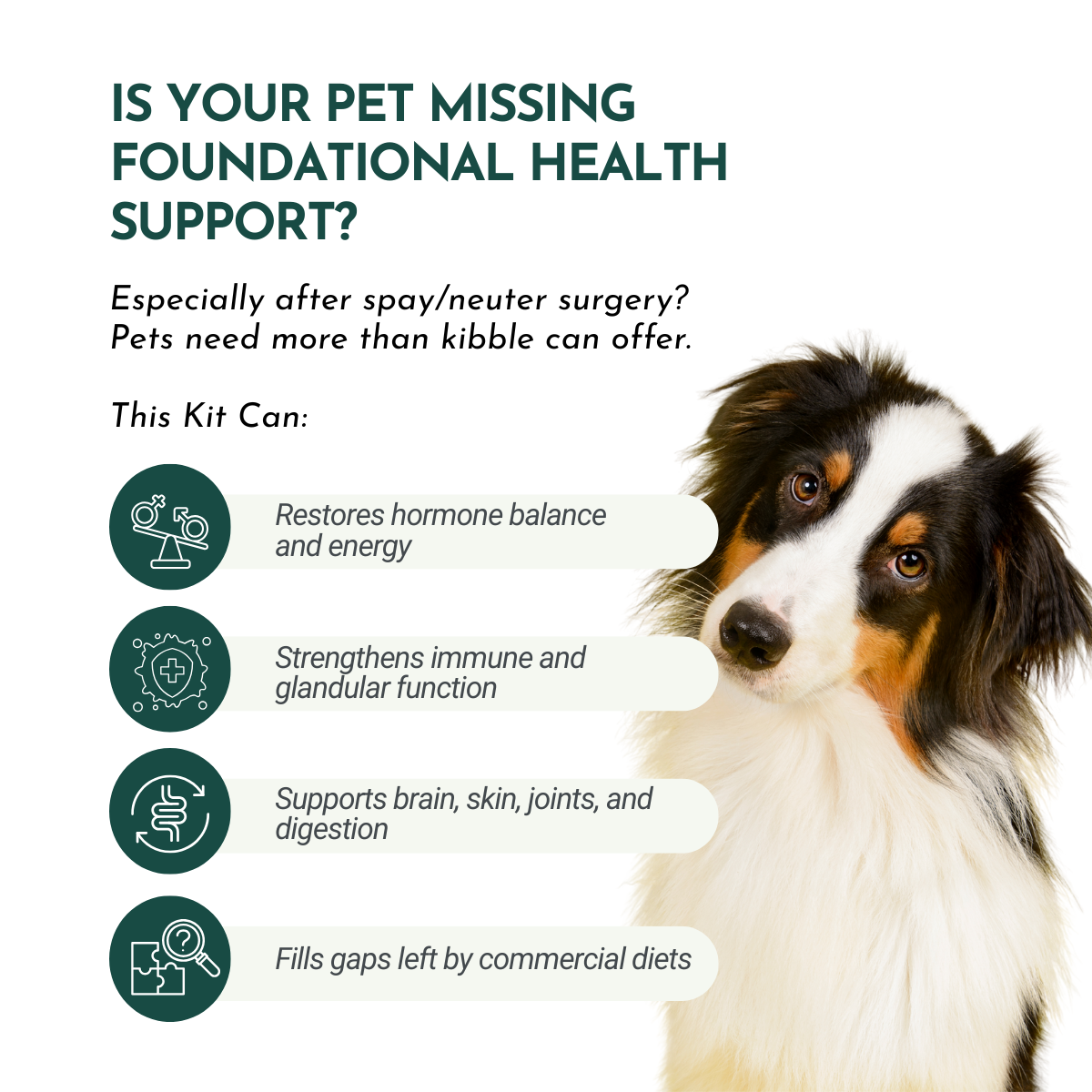 Holistic Total Body Support, which fills critical nutritional gaps and helps restore hormone balance—especially important for spayed and neutered pets.
